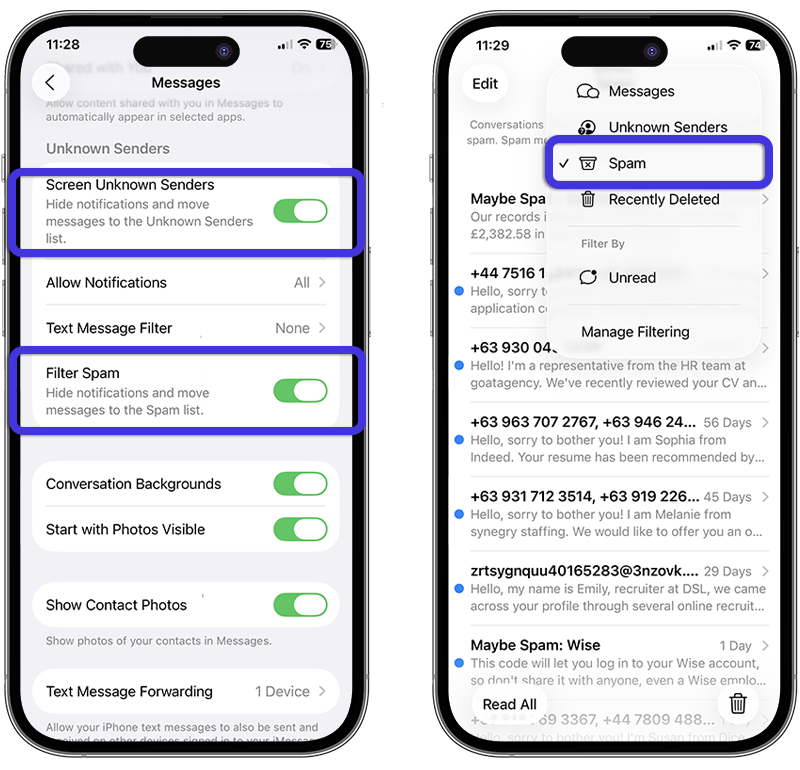 Both iPhone and Android devices offer built-in message screening features that automatically sort texts from unknown senders away from your main inbox.