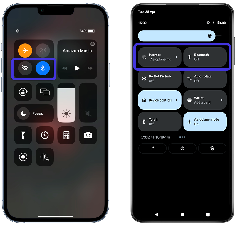 Fig 7: Enabling Wi-Fi and Bluetooth while in Airplane mode on iPhone (left) and Android (right).