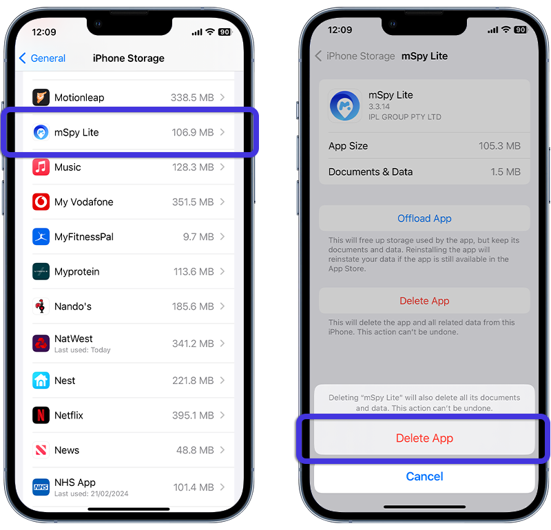 - If you find a suspicious app, tap on it then select Delete App.
