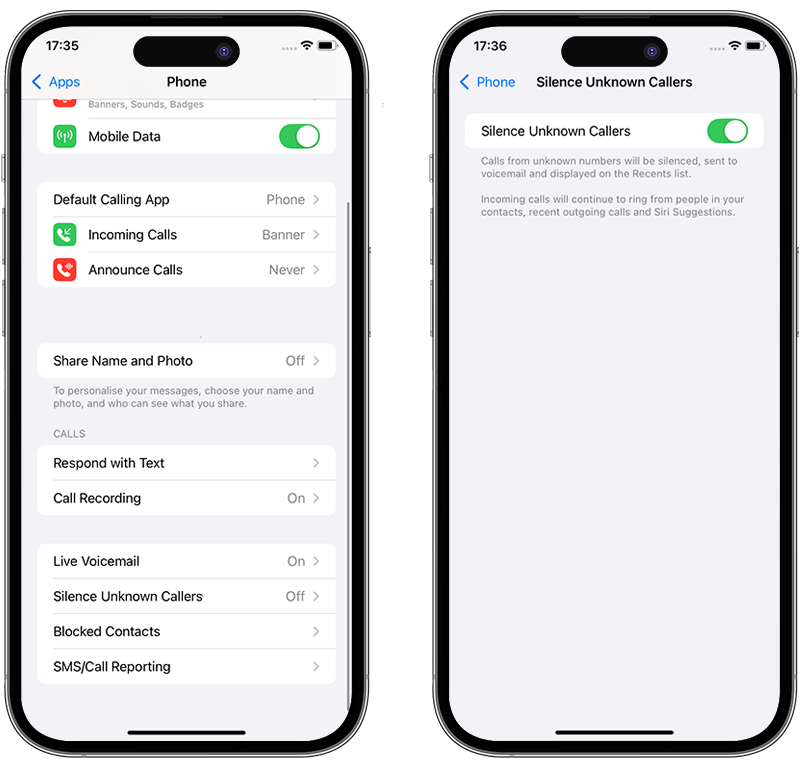 Fig 1. Enabling Silence Unknown Callers on iPhone