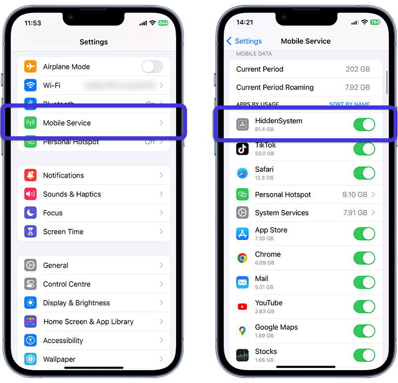 Fig 7. Checking apps for high data usage in iPhone settings.