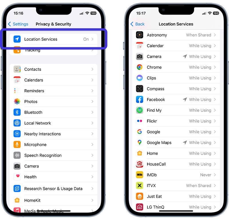 Fig 3. Checking apps with access to location on iPhone.