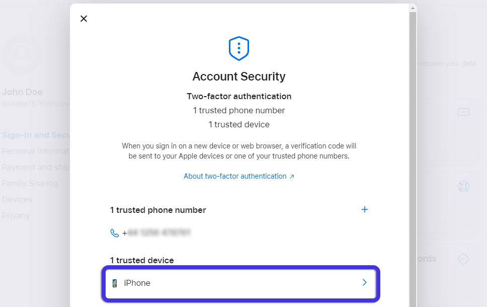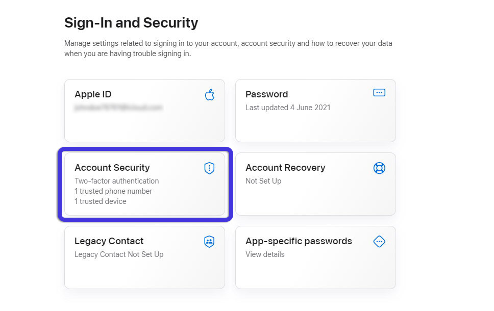 Fig 7. Apple Account Security options.