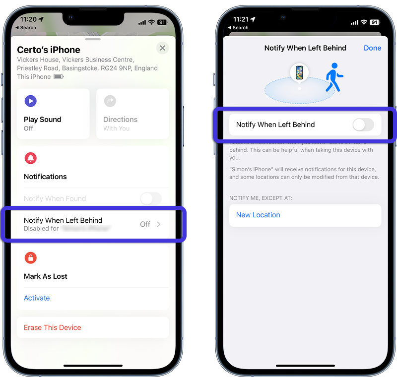 - Tap Notify When Left Behind.
