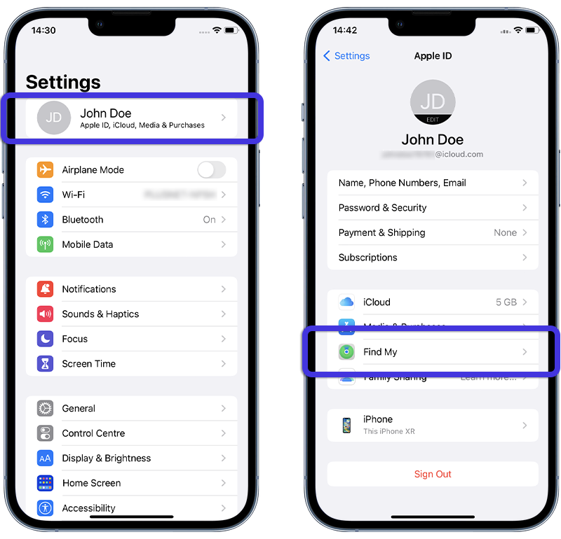Fig 10. The Find My option in Settings on iPhone.