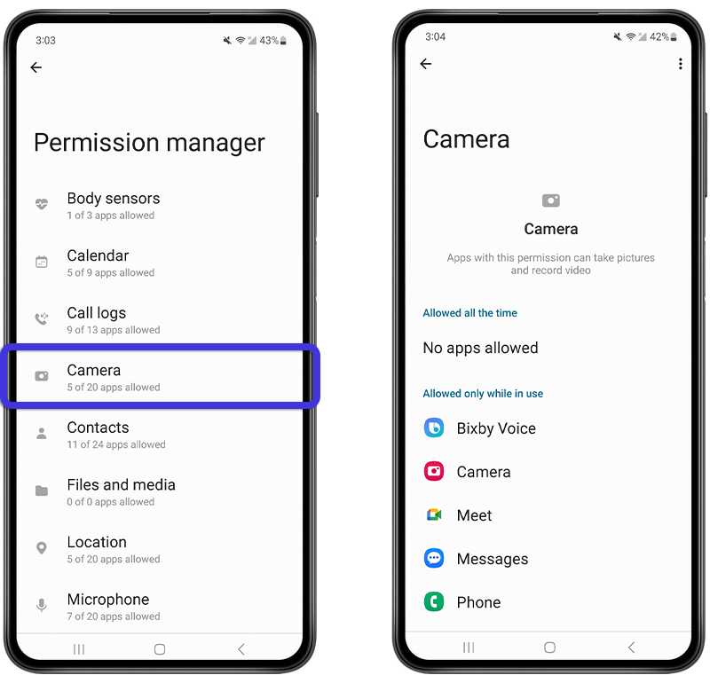 Fig 2. Reviewing app permissions on Samsung.