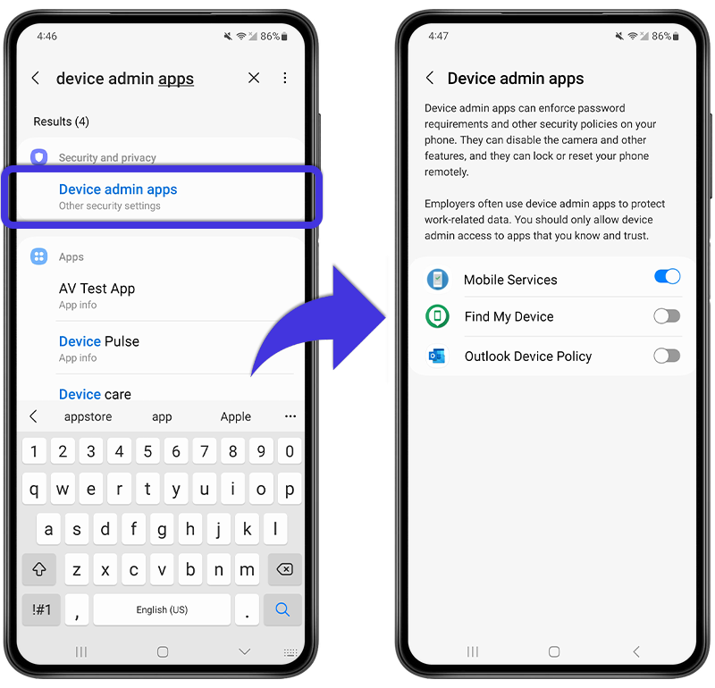 - Search for “device admin” and tap Device admin apps in the results.