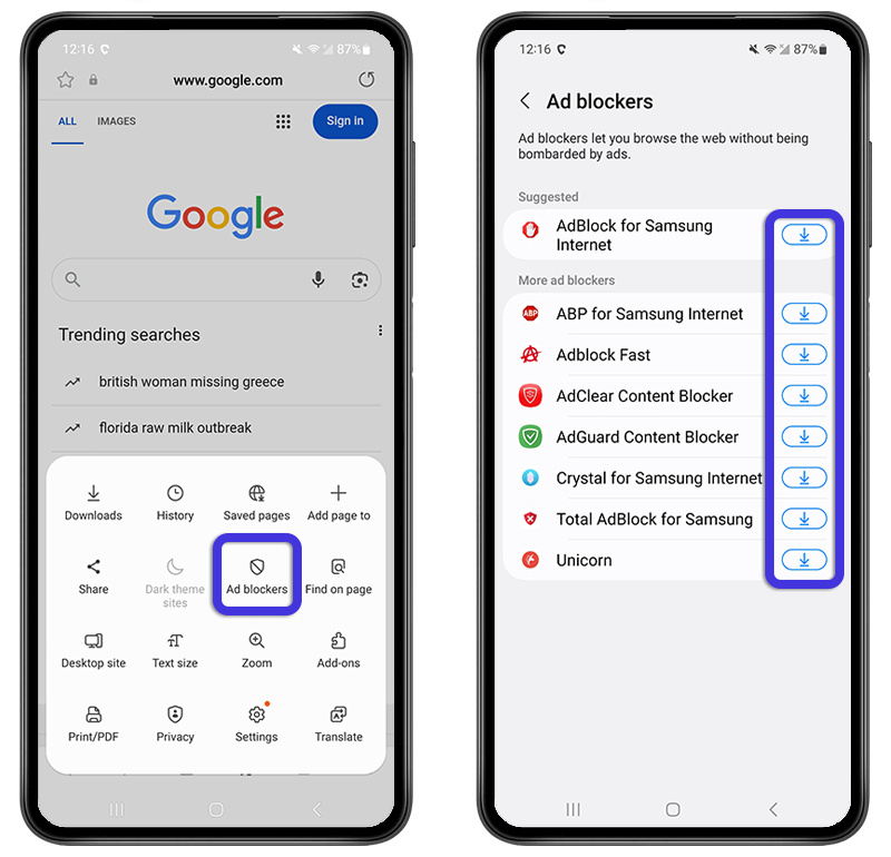 Fig 11. Enabling an ad blocker in the Samsung Internet app.