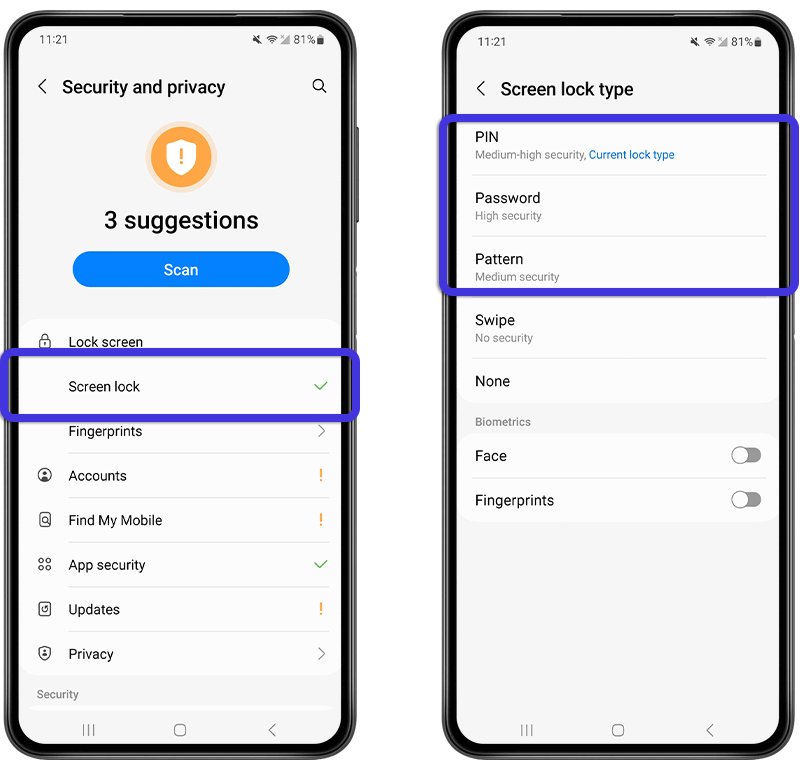 Fig 10. Changing screen lock settings on Samsung.