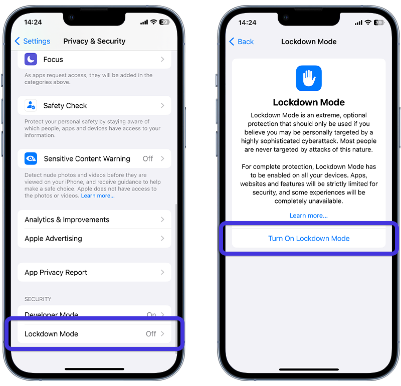 Fig 7. Enabling Lockdown Mode on iPhone.