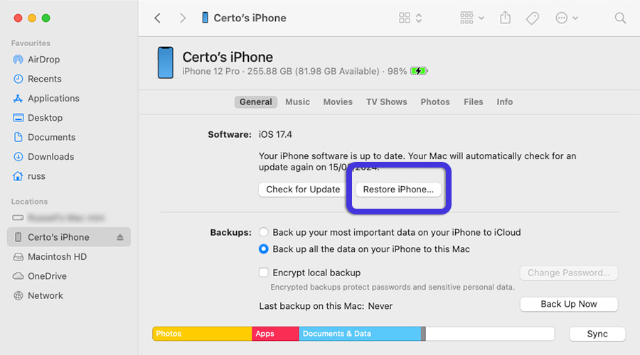 To do this, plug your iPhone into a computer and open iTunes (Windows) or Finder (Mac). Tap your device then select the Restore iPhone option. However, make sure you create a backup of your device before doing this. And don’t worry, the Jailbreak won’t carry across in the backup.