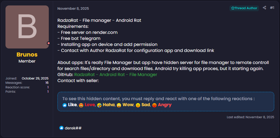 The distribution strategy reflects a troubling democratization of cybercrime tools. According to the forum advertisements, deploying RadzaRat requires only three free resources: a server hosted on Render.com (a legitimate cloud platform), a Telegram bot for command and control operations, and installation of the malicious application on the target device with appropriate permissions granted.