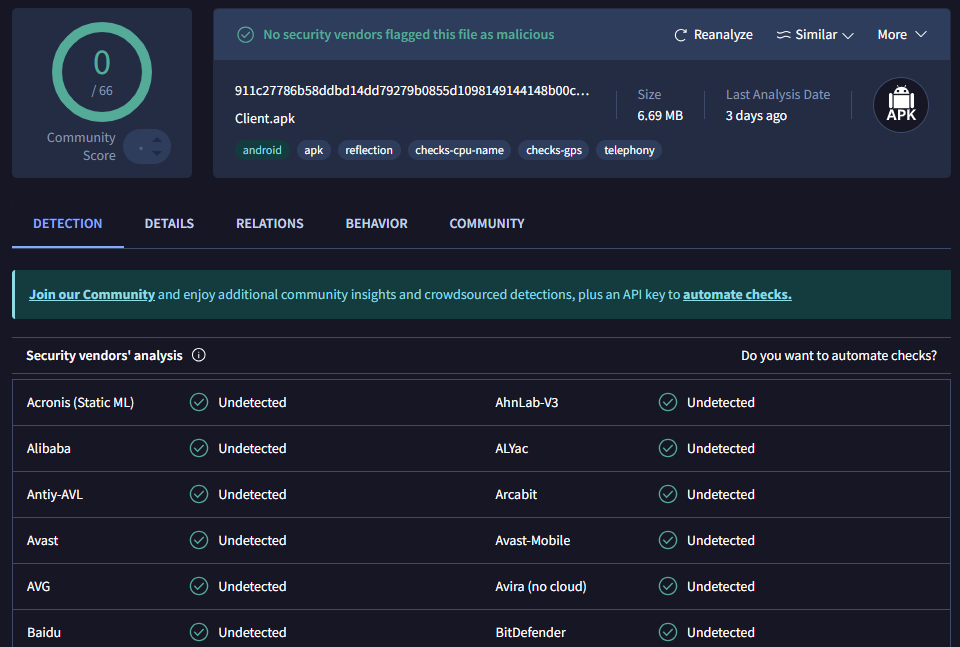 With a current detection rate of 0 out of 66 security vendors on VirusTotal, this malware represents a significant threat to Android users, particularly given its accessibility to threat actors with minimal technical expertise and its reliance on free infrastructure services.