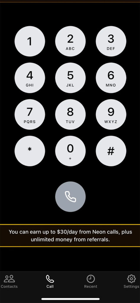 To use Neon, customers verified their phone number and then placed or received calls within the app’s dialer. Earnings were calculated only for calls routed through Neon, and users could make up to $30 per day.