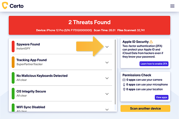 Restrictions imposed by Apple mean that security software, such as Certo AntiSpy, can only make limited changes to your device. This means that our software cannot always remove a threat automatically for you. If this is the case, we’ll always provide simple and clear instructions on how you can remove the threat yourself manually.